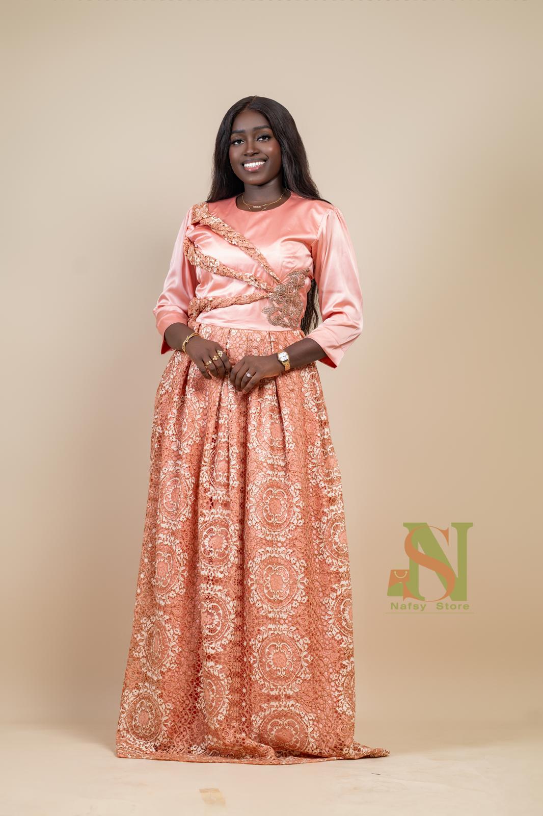 Robe Princess confectionnée sur mesure en tissu saumon perlé, alliant élégance intemporelle et raffinement. Cette création exclusive épouse parfaitement votre silhouette grâce à un ajustement personnalisé. Le saumon perlé offre une luminosité subtile et une profondeur de couleur remarquable, idéal pour les occasions spéciales. Chaque détail est travaillé avec soin pour garantir une finition impeccable et un confort optimal. Une pièce d'exception qui valorise votre prestance.